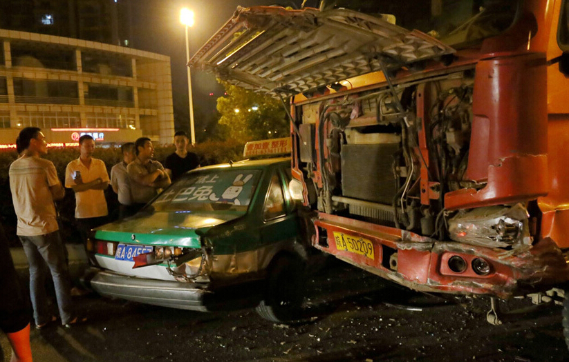 據報道,2015年9月13日晚上10點左右,安徽合肥,在習友路與懷寧路交口發生一起交通事故。一名被撞出租車的司機回憶,當時他駕駛車輛排隊停靠在十字路口轉彎區域,正準備由西向北左轉彎時,突然一輛渣土車由東向西迎面行駛而來,由于速度較快,將他的車和另外4輛車撞在一起,其中兩輛出租車被撞得一頭“扎”進綠化帶,被撞車輛出現不同程度損壞,但未造成人員傷亡。